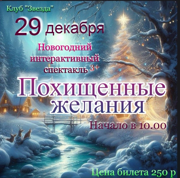 🎄 29 декабря, клуб «Звезда» приглашает маленьких зрителей на увлекательное путешествие, полное приключений и сюрпризов. Вас ждут яркие костюмы, удивительные декорации и атмосфера настоящего праздника. Начнётся веселье ровно в 10 часов утра. Стоимость участия всего 250 рублей!