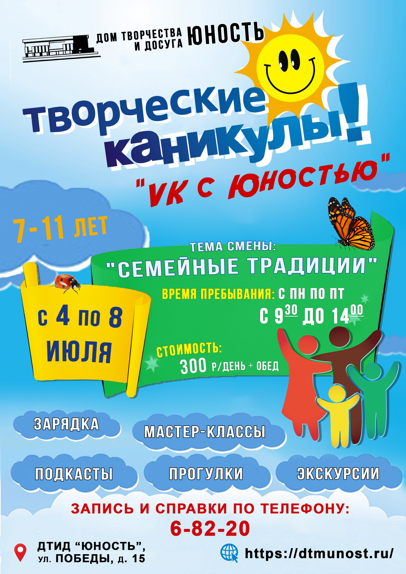 ПРИГЛАШАЕМ детей от 7 до 11 лет присоединиться к нашим Творческим каникулам «VK С ЮНОСТЬЮ» ! Ребят ожидает программа дневного пребывания, наполненная радостью и пользой, улыбками и личностным развитием! А также: