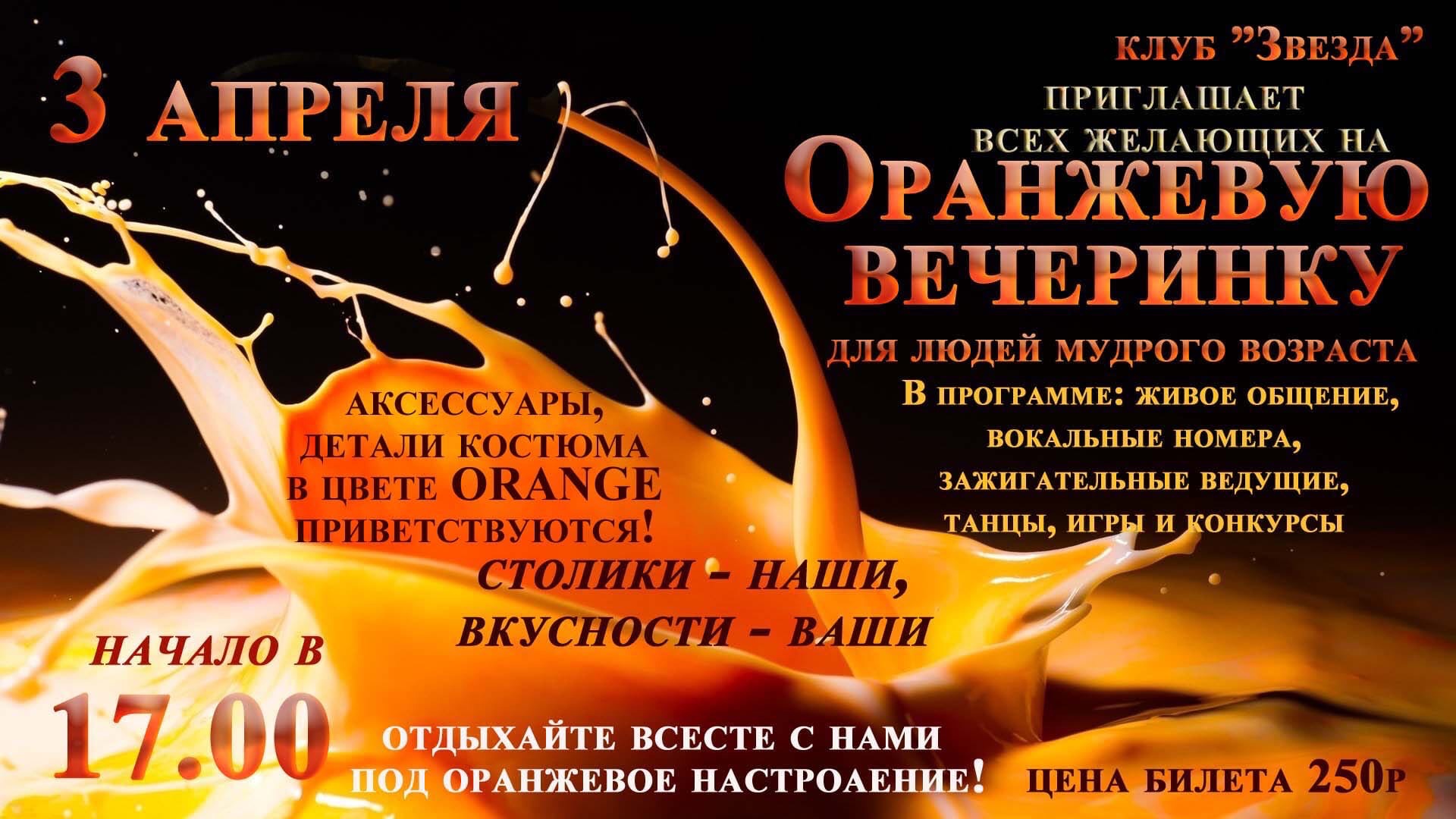 3 апреля в 17:00 клуб "Звезда" приглашает всех желающих на "ОРАНЖЕВУЮ ВЕЧЕРИНКУ" для людей мудрого возраста!