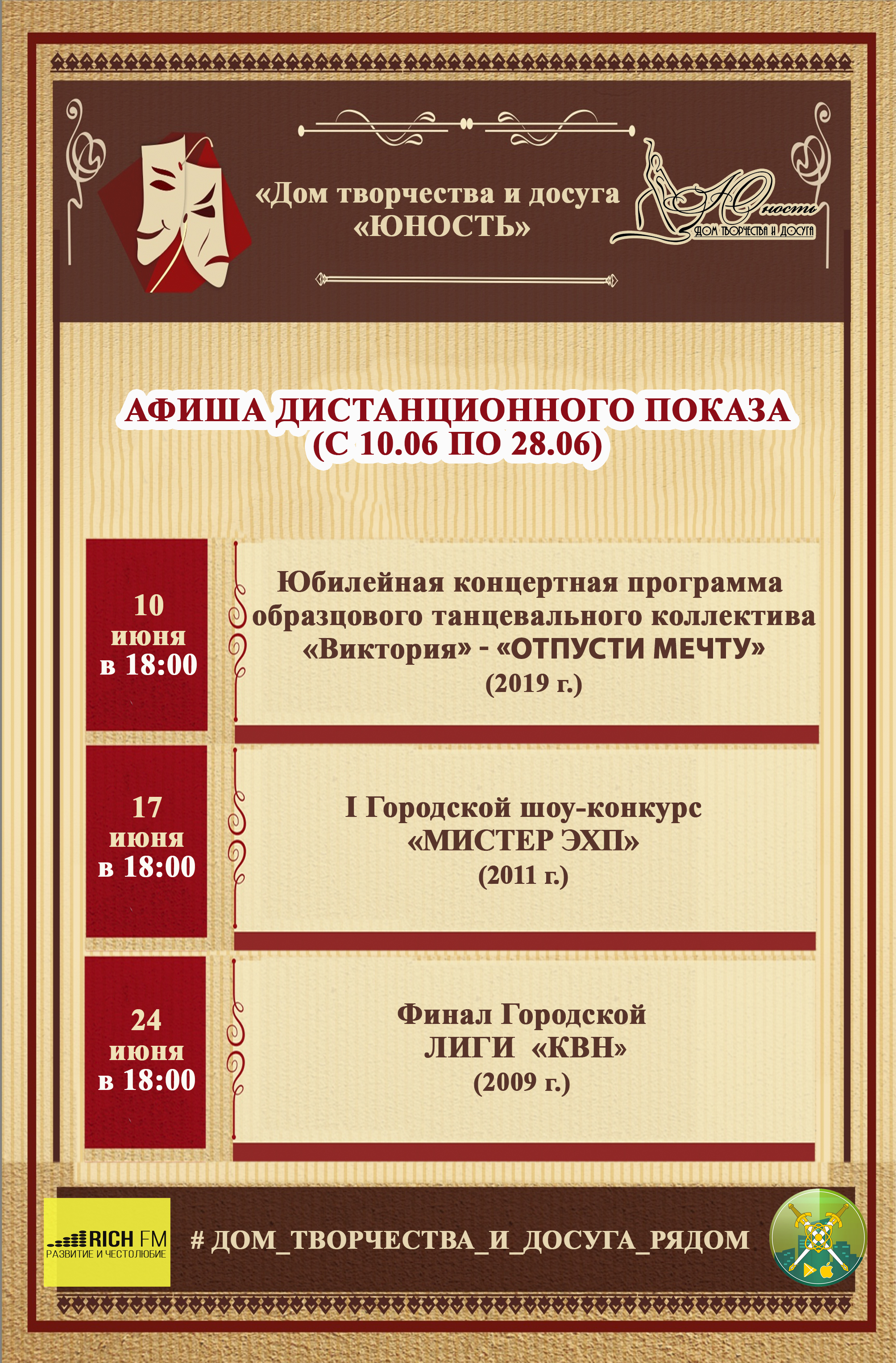 В ближайшее время вас ждут творческие проекты: Юбилейная концертная программа образцового танцевального коллектива «Виктория» - «ОТПУСТИ МЕЧТУ», I Городской шоу-конкурс «Мистер ЭХП» и Финал Городской ЛИГИ «КВН»