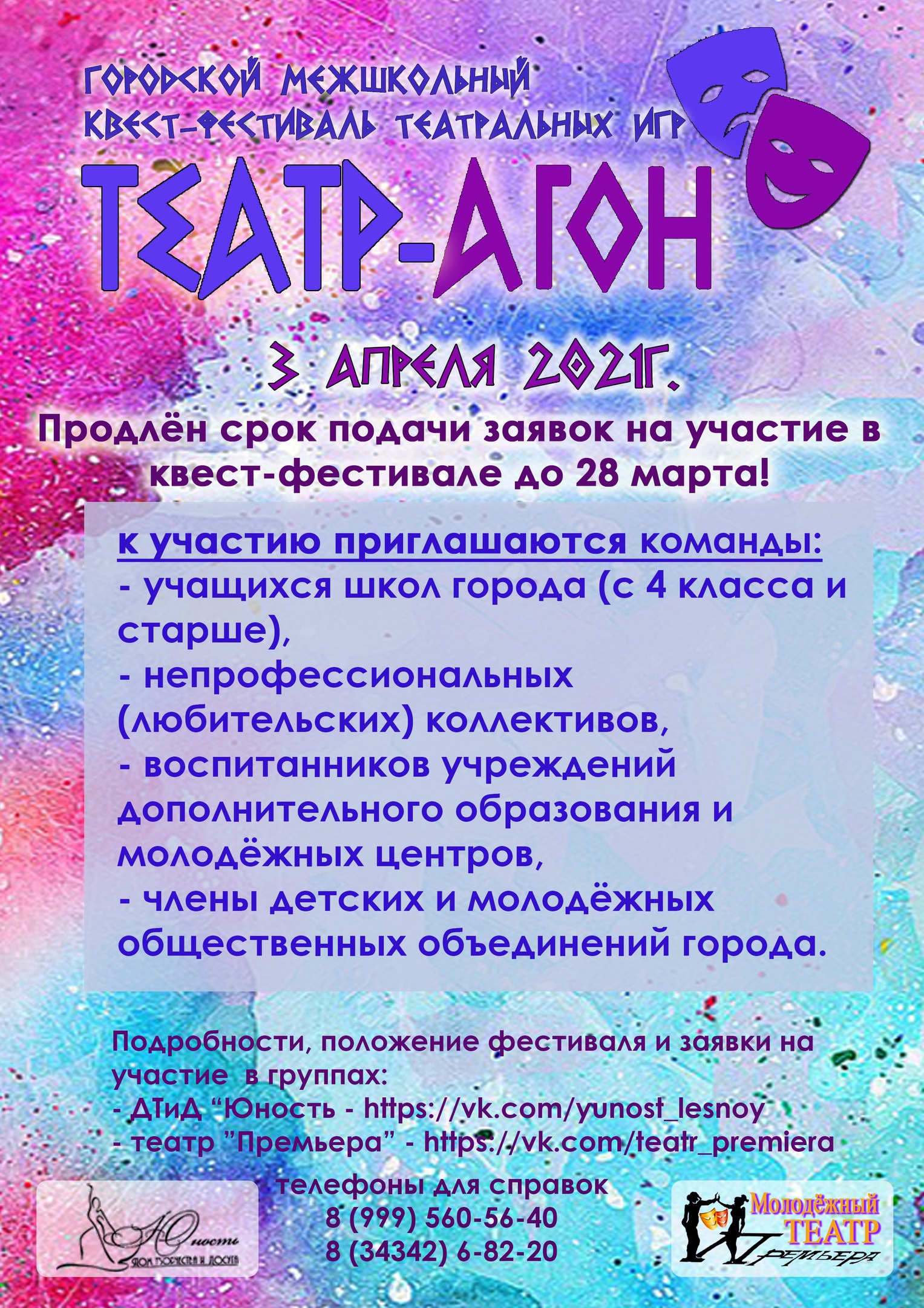 По просьбам участников мы продлеваем приём заявок на участие во II городском межшкольном квест-фестивале театральных игр "Театр-Агон - 2021"