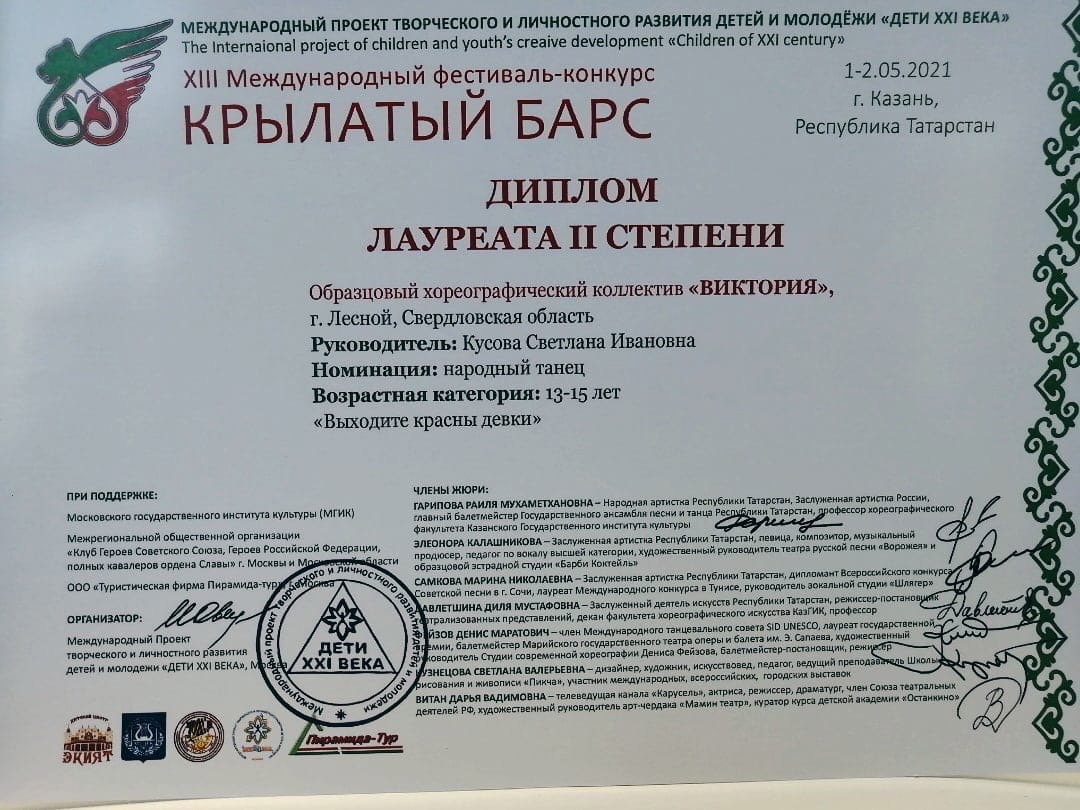 Поздравляем от всей души Образцовый хореографический коллектив "Виктория" (руководитель Кусова Светлана Ивановна) с дипломом Лауреата II степени в XIII Международном фестивале-конкурсе «КРЫЛАТЫЙ БАРС» !