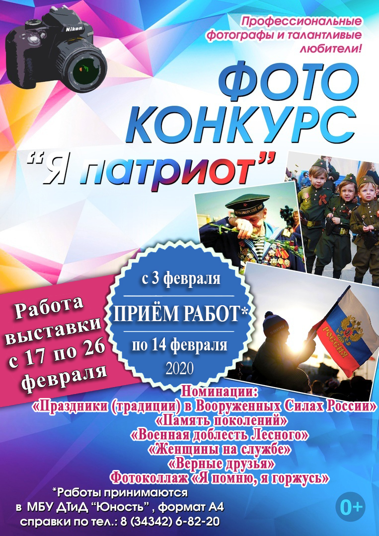 В преддверии Дня Защитников Отечества Дом творчества и досуга «Юность» проводит традиционный фотоконкурс «Я патриот». К участию приглашаются все желающие от новичков до профессионалов. С положением можно ознакомиться здесь: положение к конкурсу