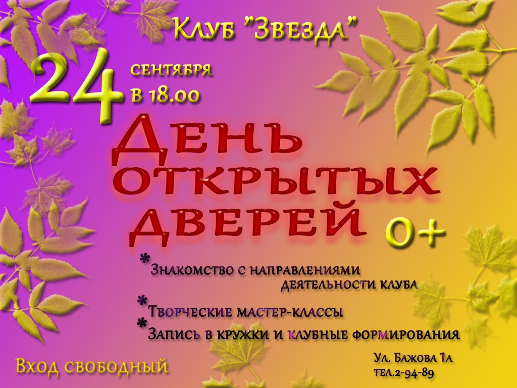 У вас будет возможность узнать нас поближе и записаться в понравившиеся клубные формирования. Дети и взрослые смогут выбрать подходящее для себя направление, познакомиться с руководителями и задать интересующие вопросы.