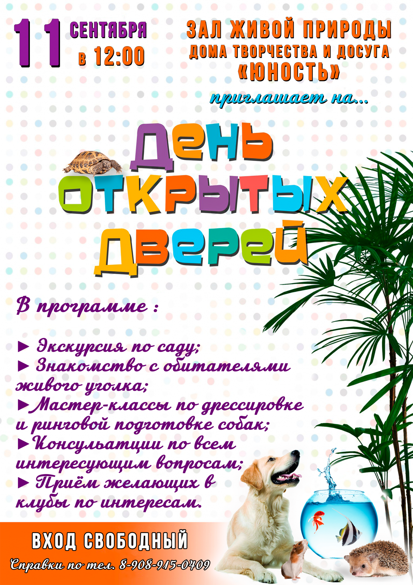 🐾 12 сентября в 12:00 приглашаем на день открытых дверей в Зал живой природы 🌱, где вы сможете познакомиться с любительскими объединениями Кинолог 🐕 и Экодом 🦔.