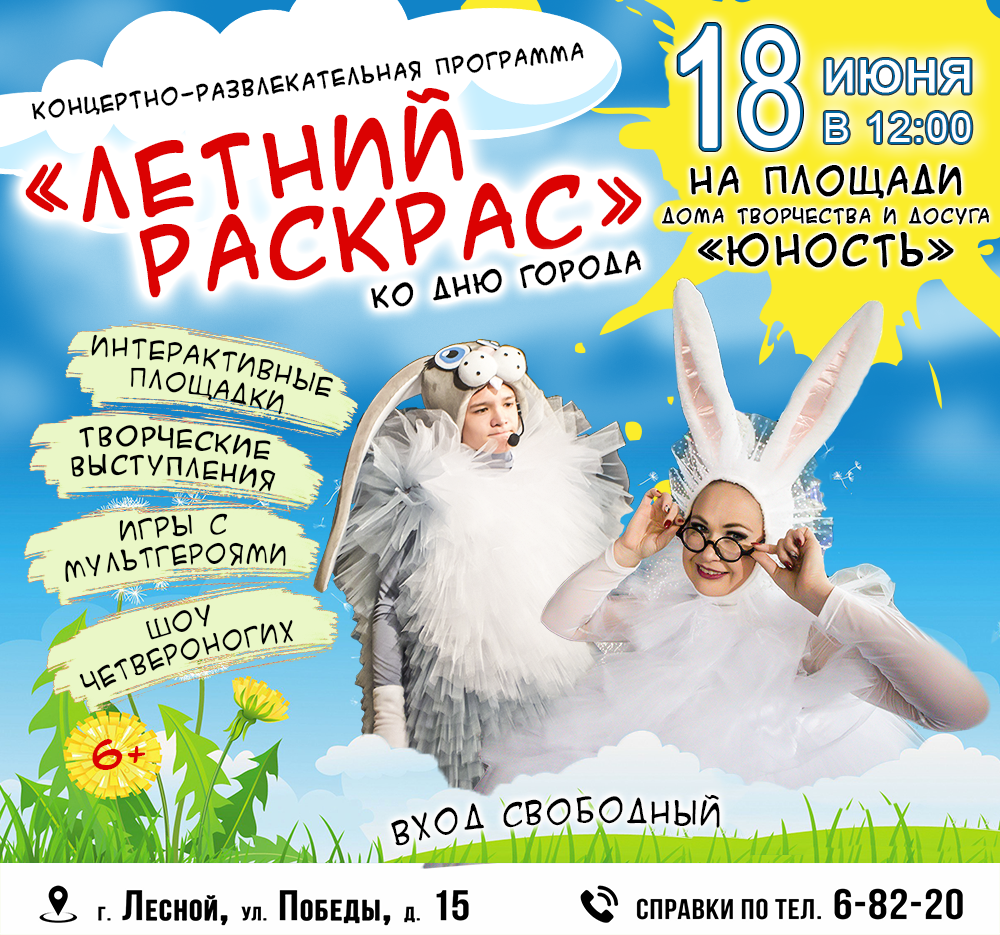 Приходите всей семьей 18 июня в 12:00 на концертно-развлекательную программу КО ДНЮ ГОРОДА — «ЛЕТНИЙ РАСКРАС»! В честь праздника мы устроим шумное веселье вместе с героями сказок!