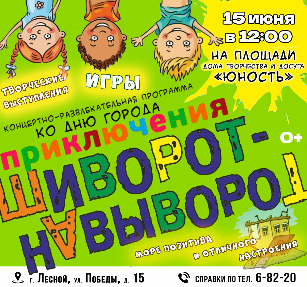 Приходите всей семьей 15 июня в 12:00 на концертно-развлекательную программу, посвященную ДНЮ ГОРОДА — «ПРИКЛЮЧЕНИЯ ШИВОРОТ-НАВЫВОРОТ»! Мы устроим шумные развлечения вместе с героями сказок!
