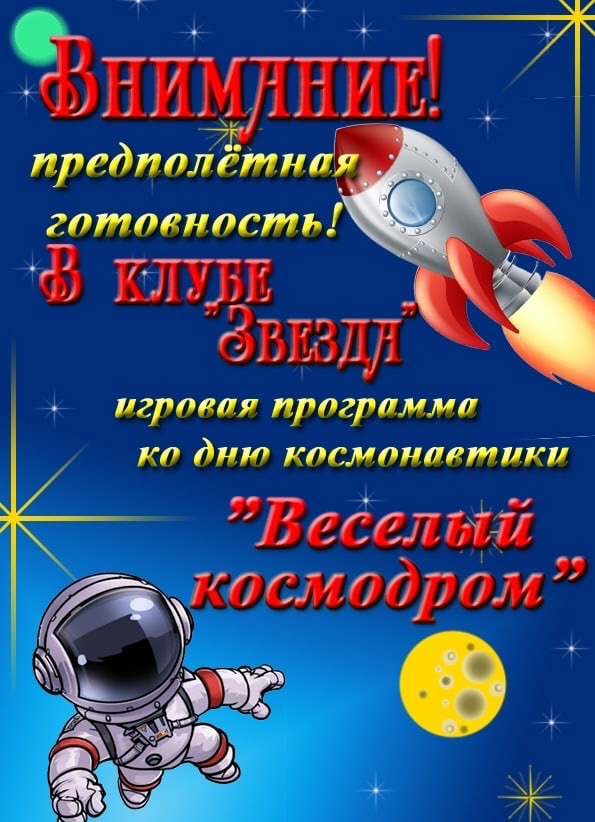 Приглашаем детей 7-11 лет (коллективные заявки) на познавательную развлекательную программу, посвящённую Дню космонавтики «Веселый космодром».