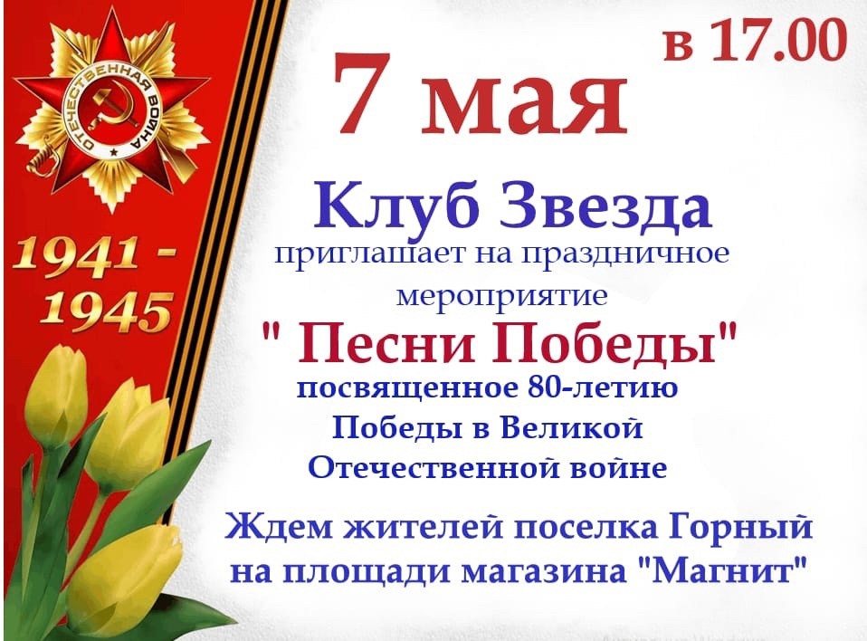 Друзья, творческие коллективы клуба «Звезда» и ДТиД «Юность» приглашают на праздничное мероприятие, где прозвучат самые известные, самые популярные песни фронтовой поры, песни, опаленные войной, песни нашей Победы!
