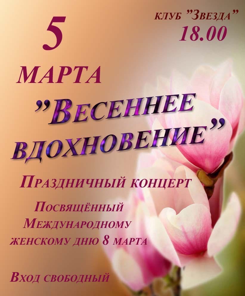 Самые очаровательные, самые милые и самые красивые представительницы прекрасной половины человечества, приглашаем вас на праздничный концерт, посвящённый Международному женскому дню!