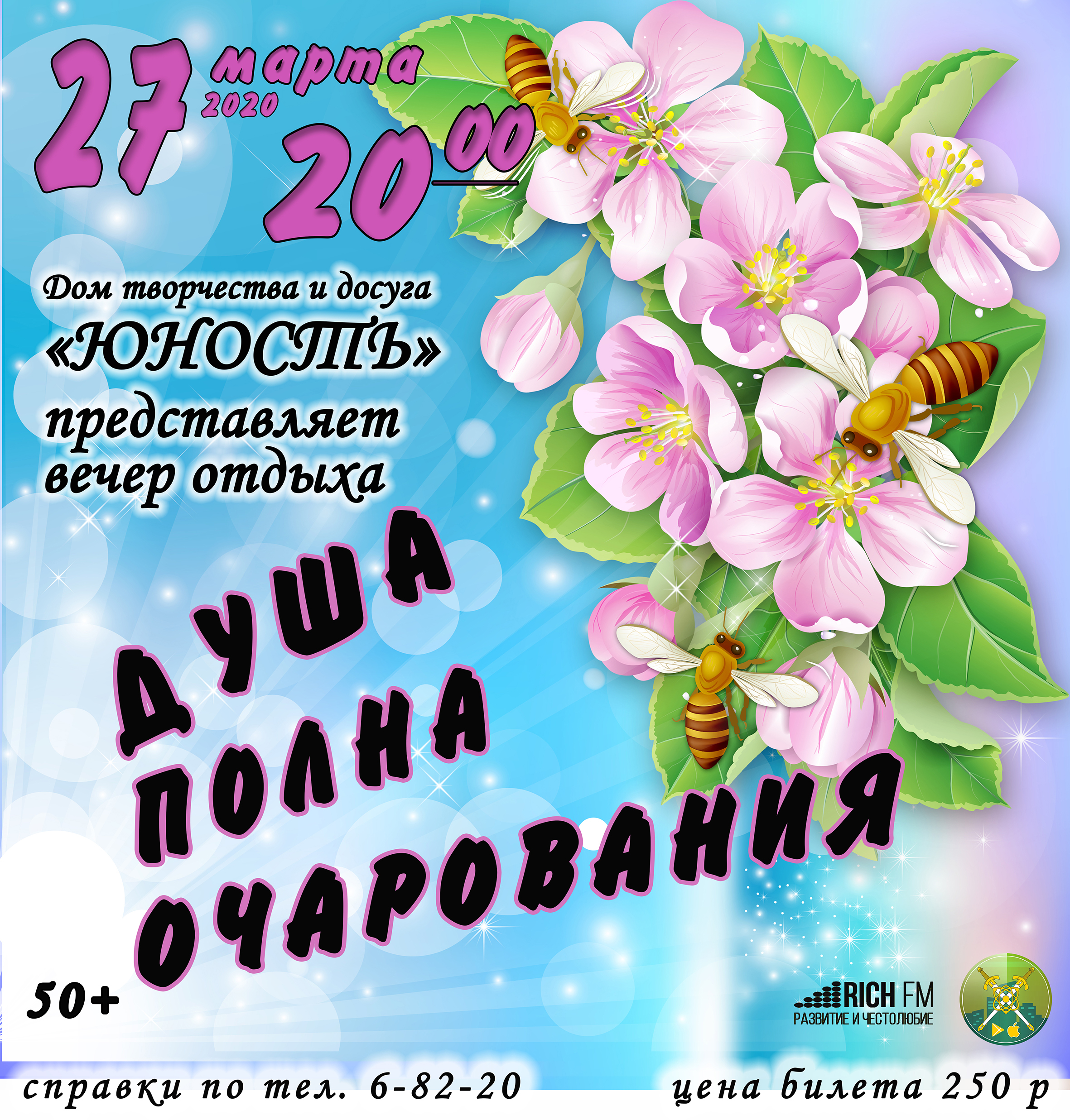 Приглашаем всех желающих на вечер отдыха "Душа полна очарования"! Вечер состоится 27 марта в 20 часов в малом зале Дома творчества и досуга "ЮНОСТЬ".