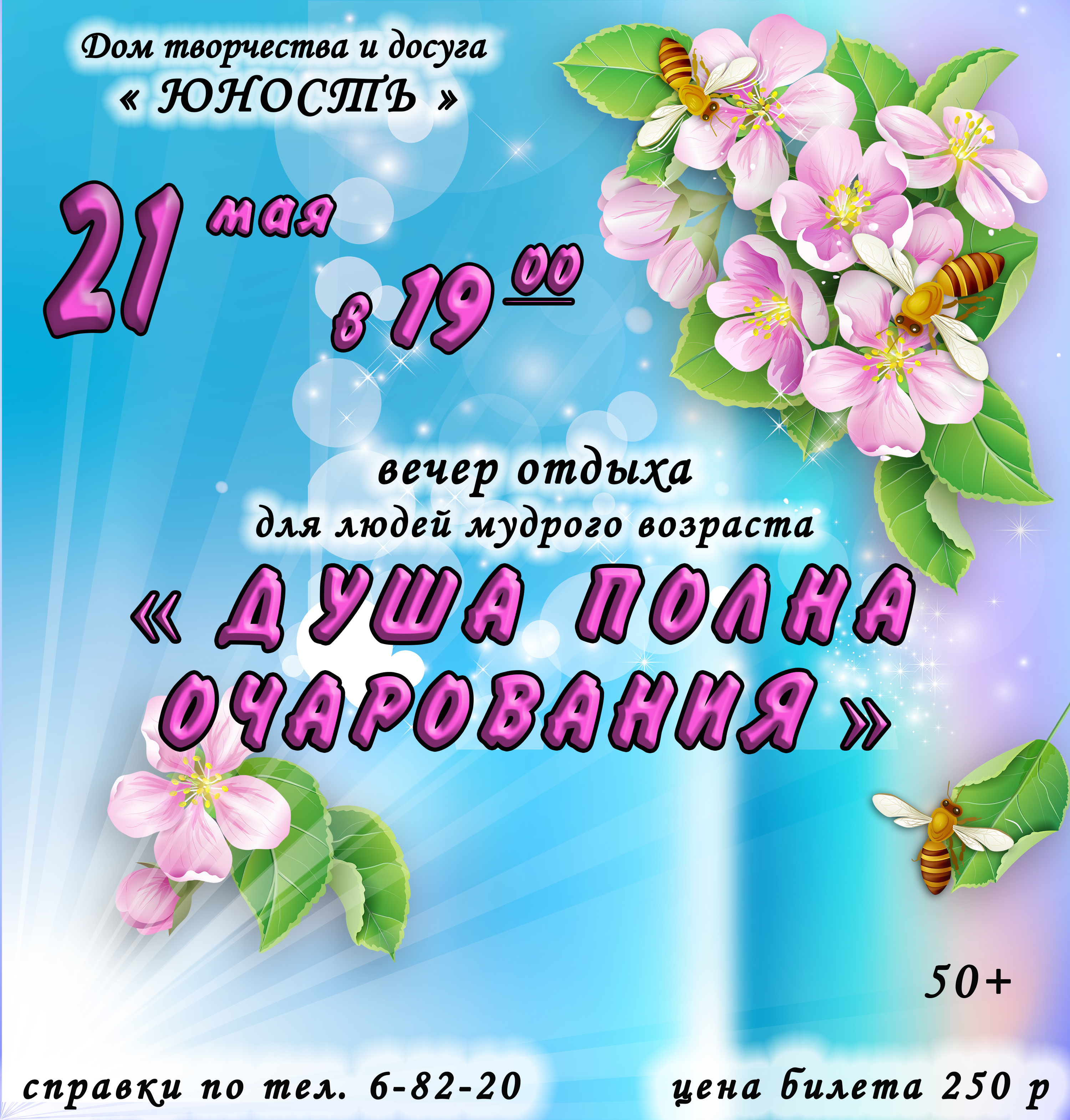 21 мая в 19:00 приглашаем всех желающих на вечер отдыха "ДУША ПОЛНА ОЧАРОВАНИЯ" для людей мудрого возраста!