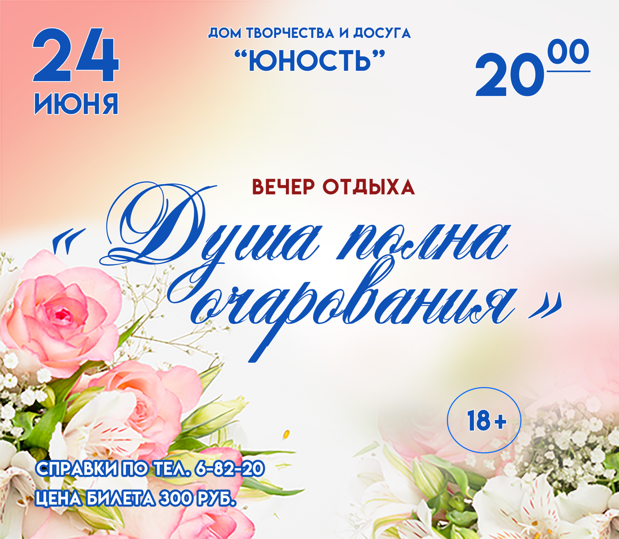 24 июня в 20:00 приглашаем всех желающих на вечер отдыха "ДУША ПОЛНА ОЧАРОВАНИЯ" ! ✨