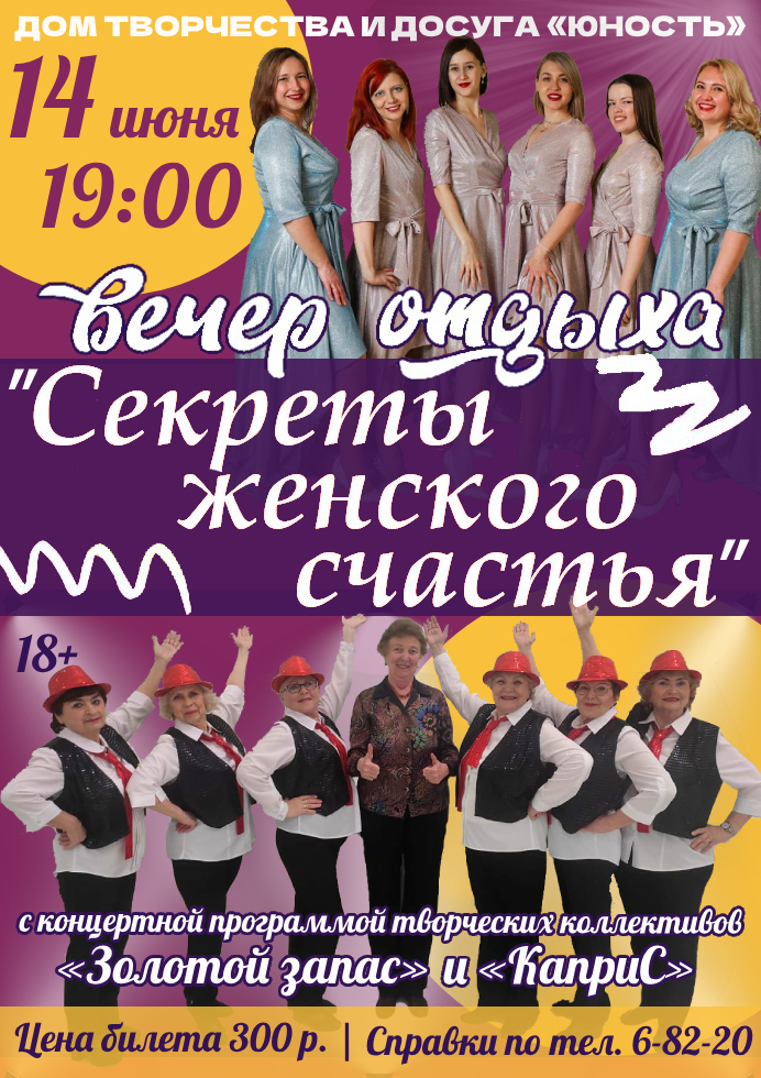 14 ИЮНЯ в 19:00 приглашаем всех желающих на вечер отдыха «СЕКРЕТЫ ЖЕНСКОГО СЧАСТЬЯ» с концертной программой вокальных коллективов «Золотой запас» и «КаприС»! Вас ждет дискотека, конкурсы, тематическая фотозона, концертные номера! Приходите, будет интересно!