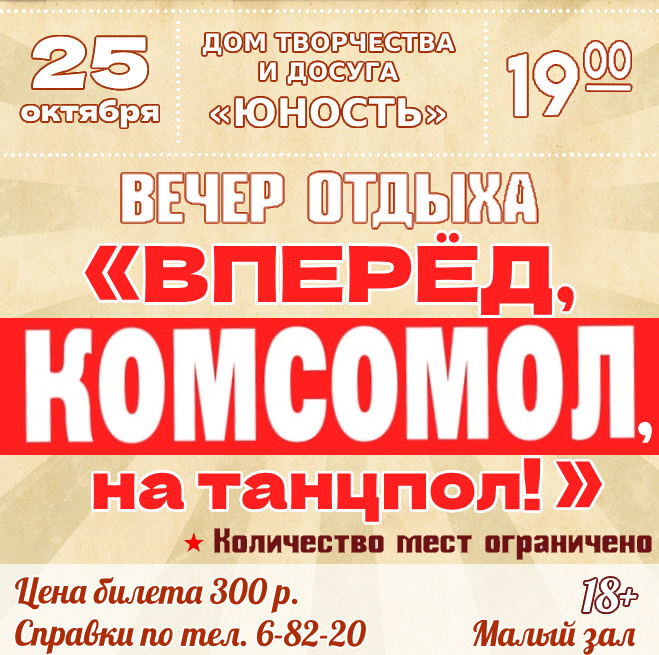 25 октября в 19:00 приглашаем всех желающих на вечер отдыха «ВПЕРЕД, КОМСОМОЛ, НА ТАНЦПОЛ!»