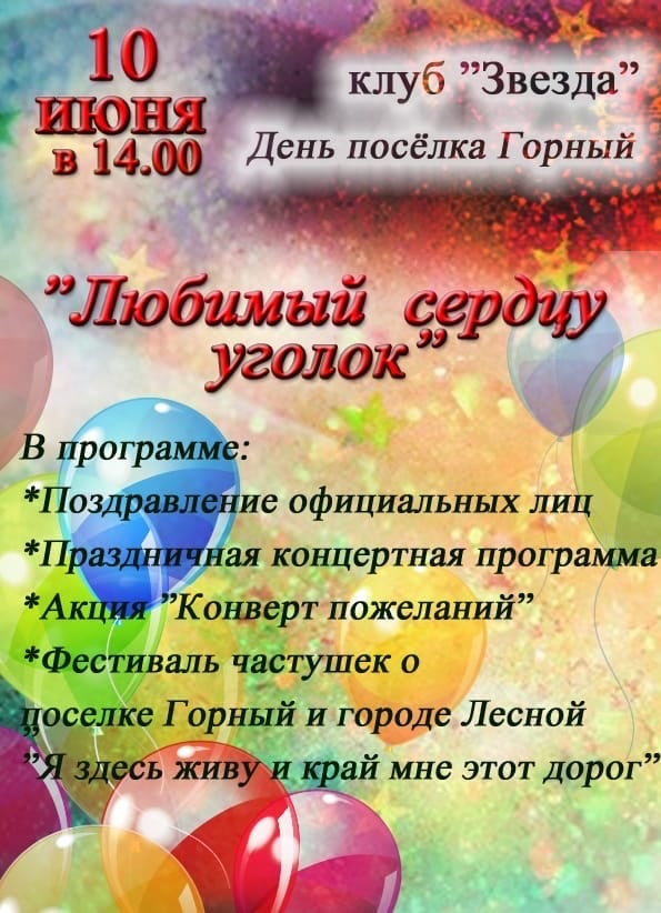 Главная / Новости / Приглашаем жителей посёлка и гостей на празднование Дня посёлка Горный !