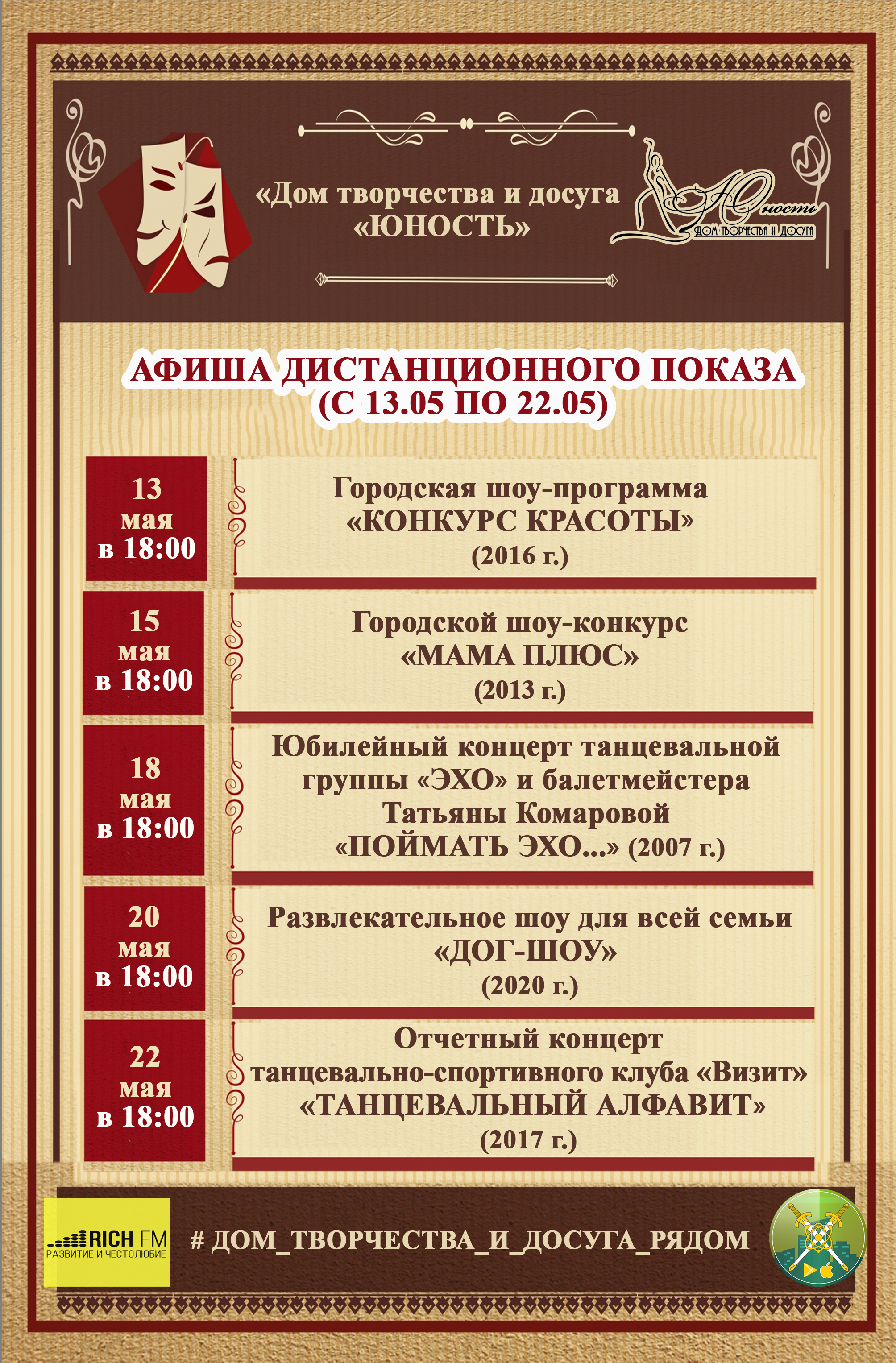 В ближайшее время вас ждут творческие проекты: Городская шоу-программа «КОНКУРС КРАСОТЫ», Юбилейный концерт танцевальной группы «ЭХО» и балетмейстера Татьяны Комаровой «ПОЙМАТЬ ЭХО...», Развлекательное шоу для всей семьи «ДОГ-ШОУ», Отчетный концерт танцевально-спортивного клуба «Визит» «ТАНЦЕВАЛЬНЫЙ АЛФАВИТ» и Городской шоу-конкурс «МАМА ПЛЮС»