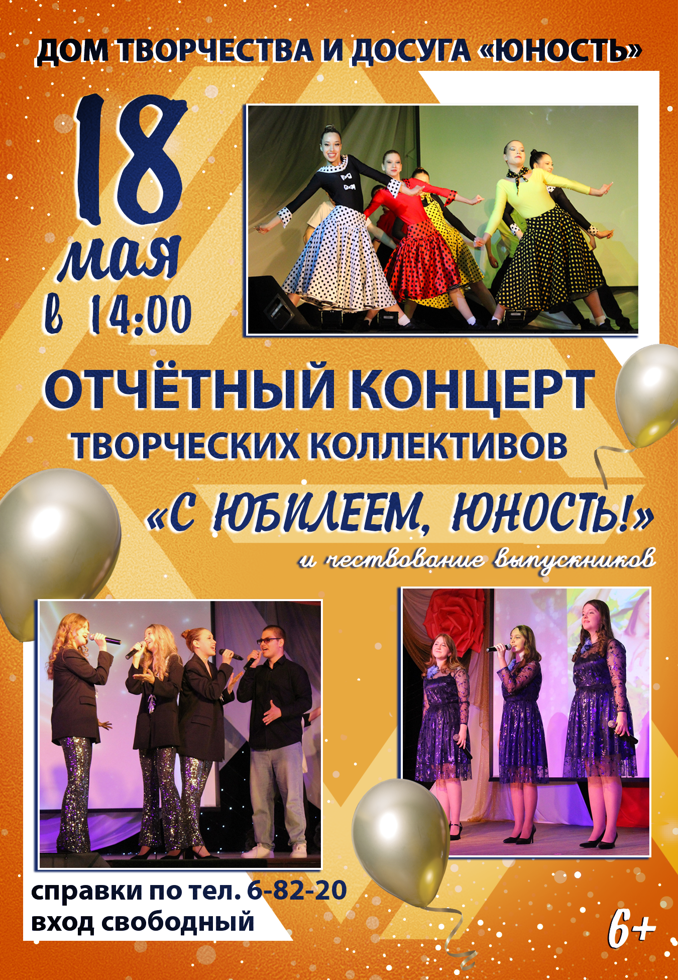 Дорогие друзья! С радостью приглашаем ВСЕХ на ОТЧЁТНЫЙ КОНЦЕРТ творческих коллективов «С юбилеем, Юность»!