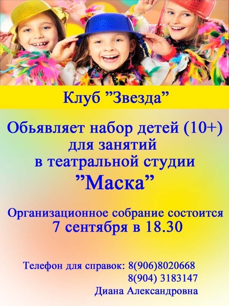 Театральная студия «МАСКА» приглашает детей от 10 лет попробовать свои силы в театральном искусстве. Театральный кружок даёт детям множество преимуществ: в школе, при общении с родителями, взрослыми и сверстниками, в развитии и познании мира ... одним словом – в жизни!