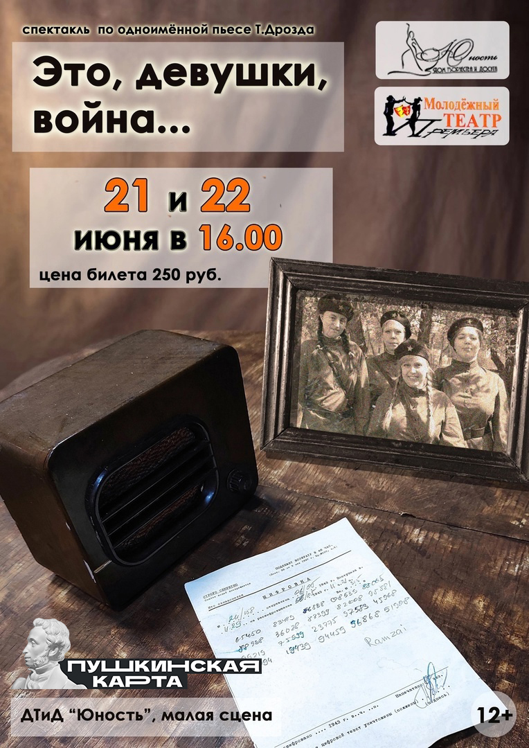 Уже СЕГОДНЯ в 16:00 на малой сцене ДТиД «Юность» состоится показ СПЕКТАКЛЯ «ЭТО, ДЕВУШКИ, ВОЙНА...», затрагивающий глубокие темы и важные вопросы, актуальные даже спустя десятилетия. Не упустите шанс окунуться в историю Великой Победы!