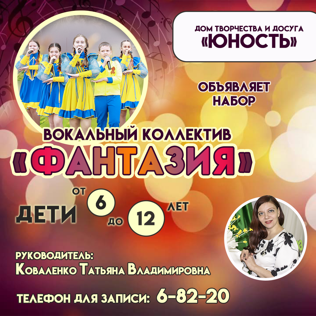 Вокальный коллектив "ФАНТАЗИЯ" (рук. Коваленко Т.В.) объявляет дополнительный набор детей 6-12 лет