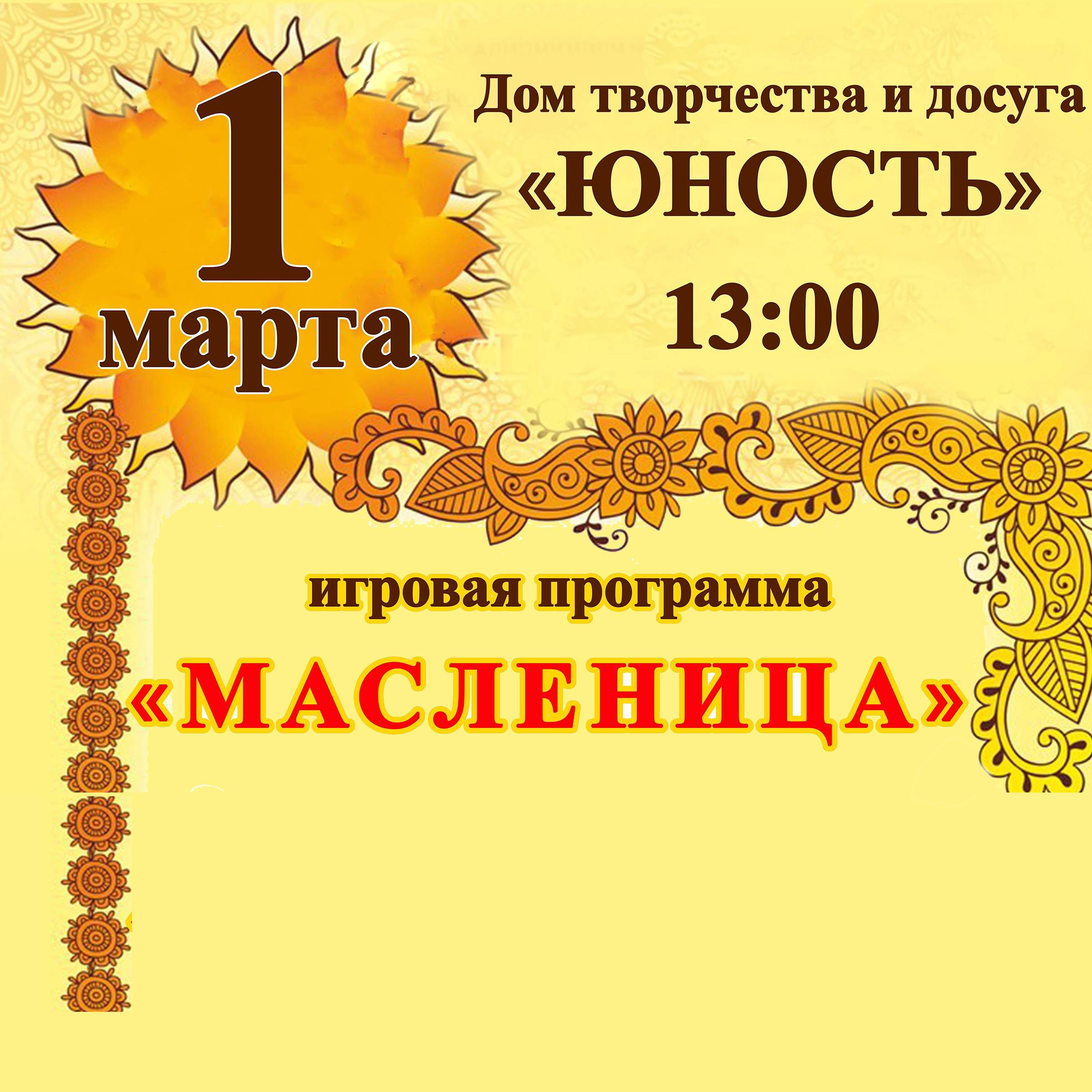 1 марта Дом творчества "Юность" провел традиционные масленичные гулянья. Веселье проходило в полном разгаре. Мероприятие началось в 13 часов, праздник сопровождался песнями и плясками, а также конкурсами и закончился импровизированным сожжением соломенной бабы Масленицы, этот обряд символизирует начало весны, уничтожение всего старого и освобождение места для нового.